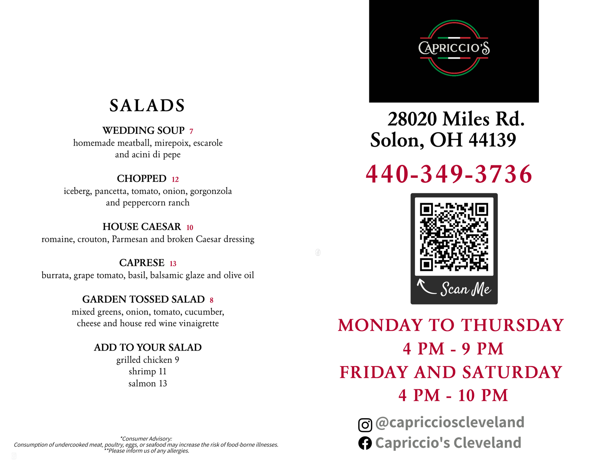 Consuming raw or undercooked meats, poultry, seafood, shellfish, or eggs may increase your risk of foodborne illness.