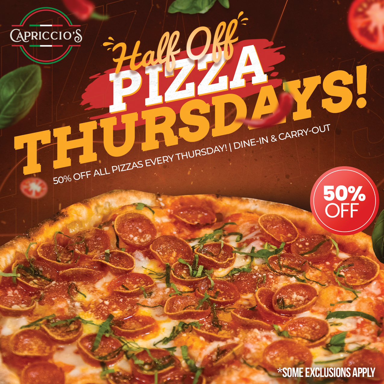 - Applicable to all signature and "build your own" pizzas.